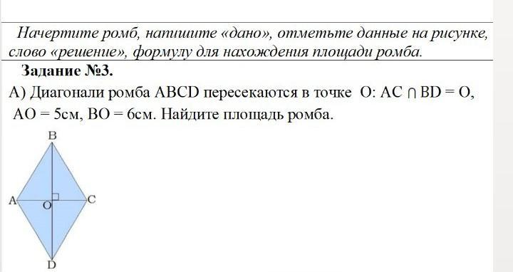 ПлоПлощадьПлоПлощадь ромба равна половине произведения его диагоналей. Точкой пересечения диагонали делятся пополам, следовательно BD=12, AC=10