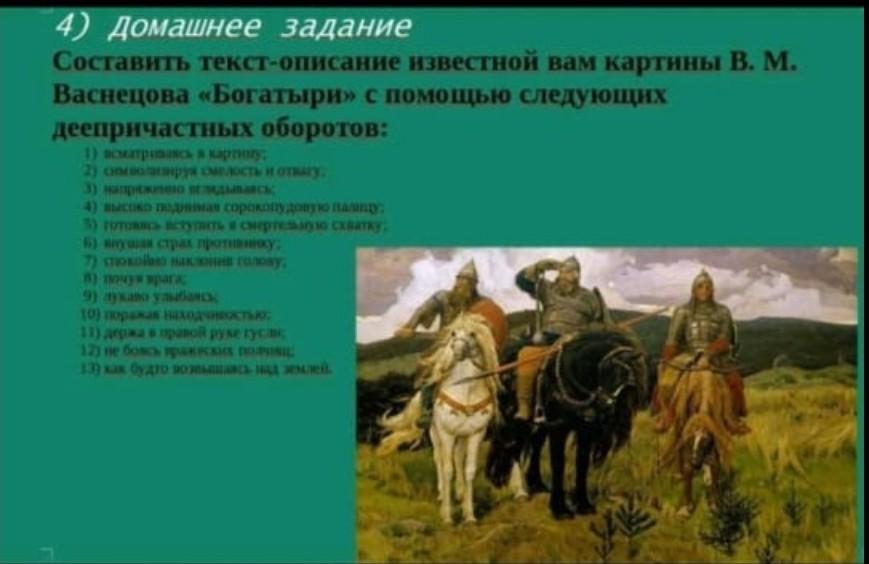 Всматриваясь в детали картины Васнецова "Богатыри" нельзя не отметить могущественно восседающих всадников, русских богатырей, на своих верных скакунах. Их фигуры, символизируя смелость и отвагу, будто бы возвышаются над окружающим пейзажем, демонстрируют готовность воинов Руси стоять за Родину до конца. Добрыня Никитич и Илья Муромец, напряженно вглядываясь в серые облачные дали, предстают во всей своей богатырской красе и мощи. Высоко поднимая сорокапудовую палицу, Илья Муромец, готовясь вступить в смертельную схватку, сильнее опирается на спину своего верного вороного коня - во всей фигуре Муромца читается напряженность и мышечное ожесточение. Внушая страх противнику, широкоплечие кони, выпучив глаза, смотрят вперед, будто готовясь растоптать вражеские войска, отскочить от череды огненных стрел. Конь Ильи Муромца, почуя врага, красным, полным животной агрессии взглядом упирается вперед, будто перенимая боевое настроение восседающего сверху богатыря. Спокойно наклонив голову, прижимается к земле верный конь Алеши Поповича. Алеша Попович же, отважный гусар и песенник, лукаво улыбаясь и держа в правой руке гусли, показан в состоянии менее напряженном, чем его соратники. Молодой богатырь готов вступить в бой со своим огненным рвением, как подобает творческой, бойкой натуре. Васнецов, поражая созерцателей картины своей новаторской и художественной находчивостью, позади русских богатырей показывает кружащих над полем орлов как символ грядущей опасности и гибели. Как будто возвышаясь над землей, герои русских былин готовы к битве, из которой точно выйдут победителями, ведь в их сердцах пылает любовь к матушке-Руси, придающая сил и воинского, незыблемого рвения.