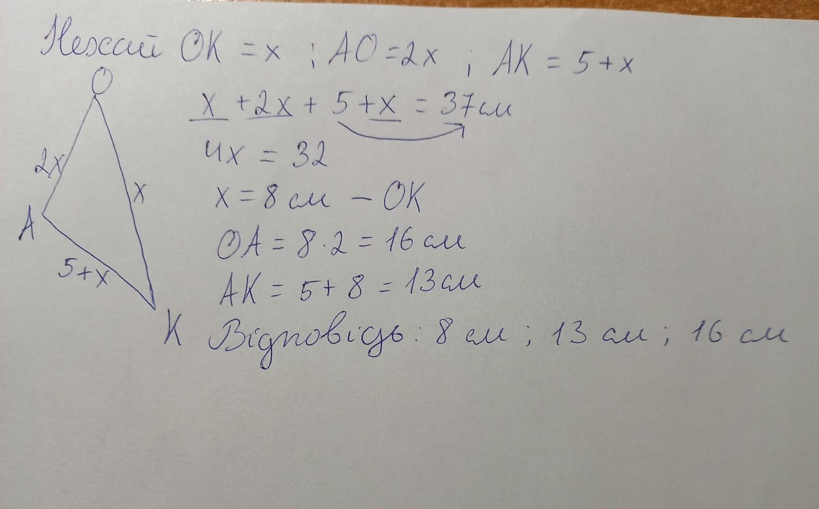 Одна сторона трикутника у 2 рази менша за другу і на 5см менша за третю. Знайти сторони трикутника, якщо його периметр дорівнює 37см.