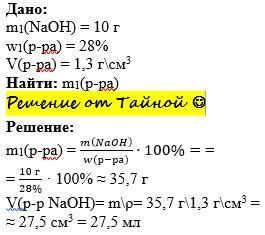 1) при растворении 10г гидроксида натрия в воде получили 28% раствор. Вычислить обьем полученного раствора (плотность 1,3г/см3)
