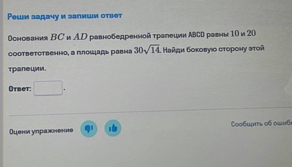 (10 + 20) / 2 * h = 30√14 => h = 2√14