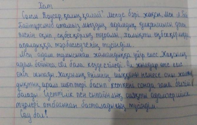 2-тапсырма: Ақынның «Тұқымын адалдықтың шаштым, ектім...» деген өлең жолдарындағы басты ойын дамытып, адалдық» жайлы ет пікіріңізді замандастарыңызға хат түрінде жазыңыз. Шынайы өмірмен байланыстырыңыз.