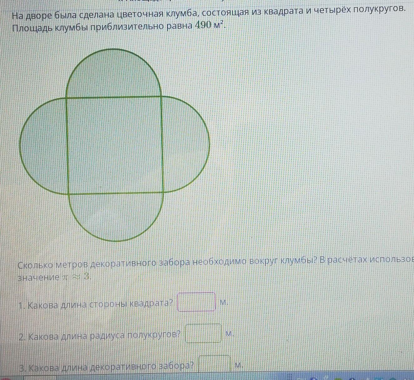 Ответ: радиус полукруга равен 7 м, сторона квадрата равна 14 м и длина ограды равна 84 м.