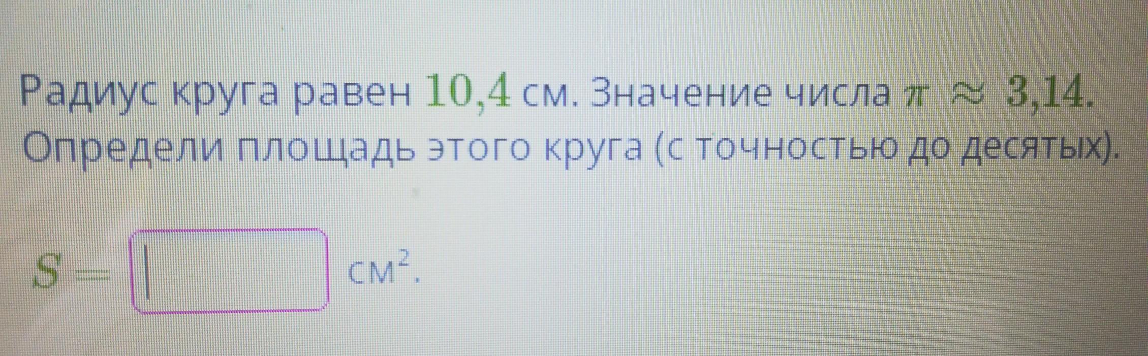 Площадь равна π×r²=3,14*10,4²=339,6cm².