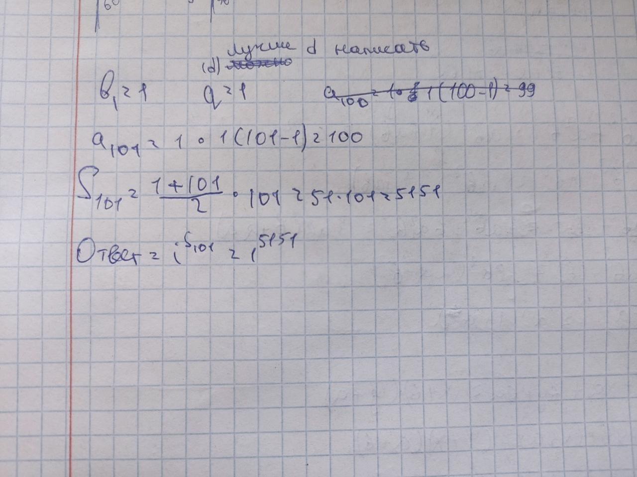 Попробовал решить арифметической прогрессией, считая что при умножении одинаковых членов но разных степеней, член остается тем же, но степени плюсуются. Применяя арифм.прогрессию находим 101 элемент ( i^100 ), после находим сумму степеней от 1 до 100. Надеюсь такая логика сработает с мнимыми числами.
