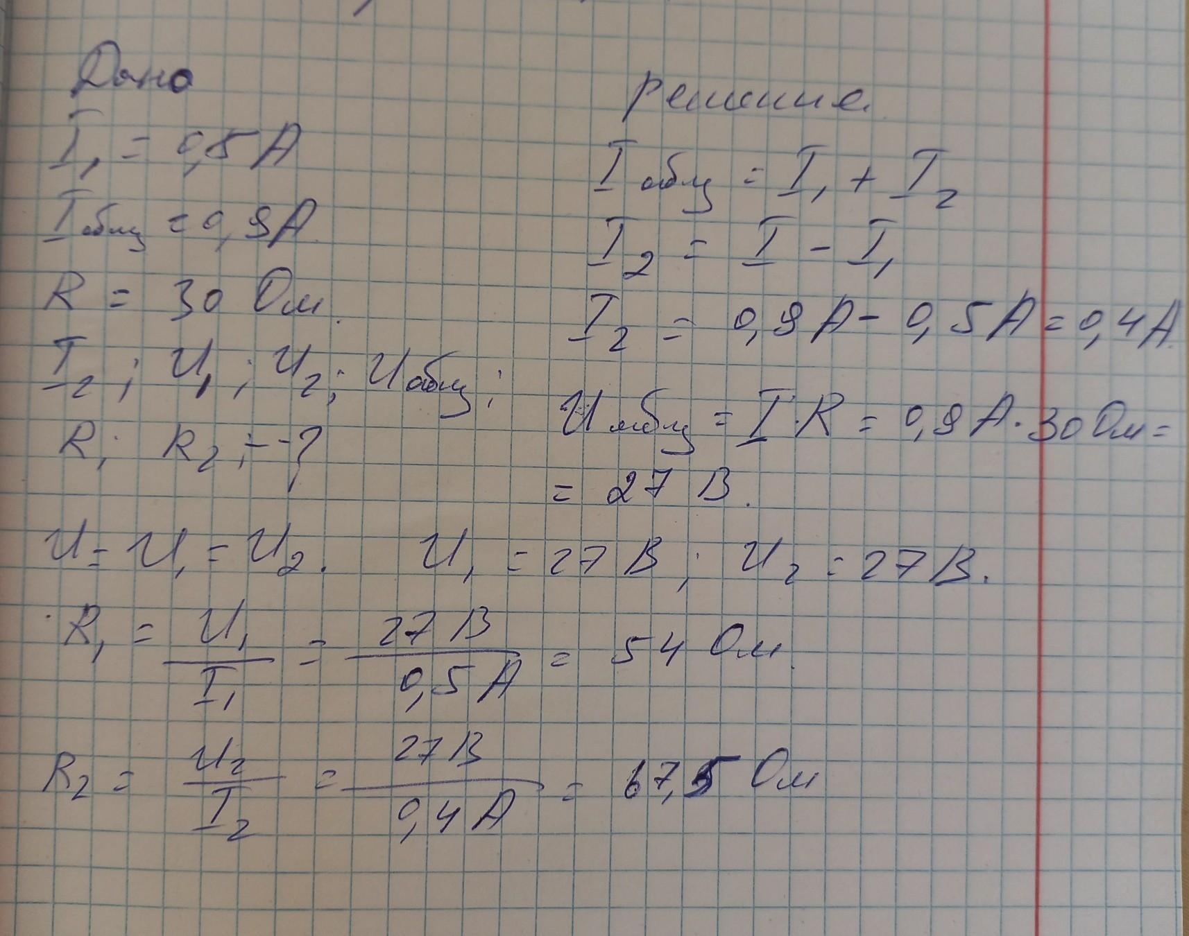 Два проводника соединены параллельно. Сила тока в первом проводнике 0,5 А, а на всем участке цепи – 0,9 А. Сопротивление участка 30 Ом. Определите силу тока во втором проводнике, напряжение на каждом проводнике и на участке цепи, а также сопротивление каждого проводника.