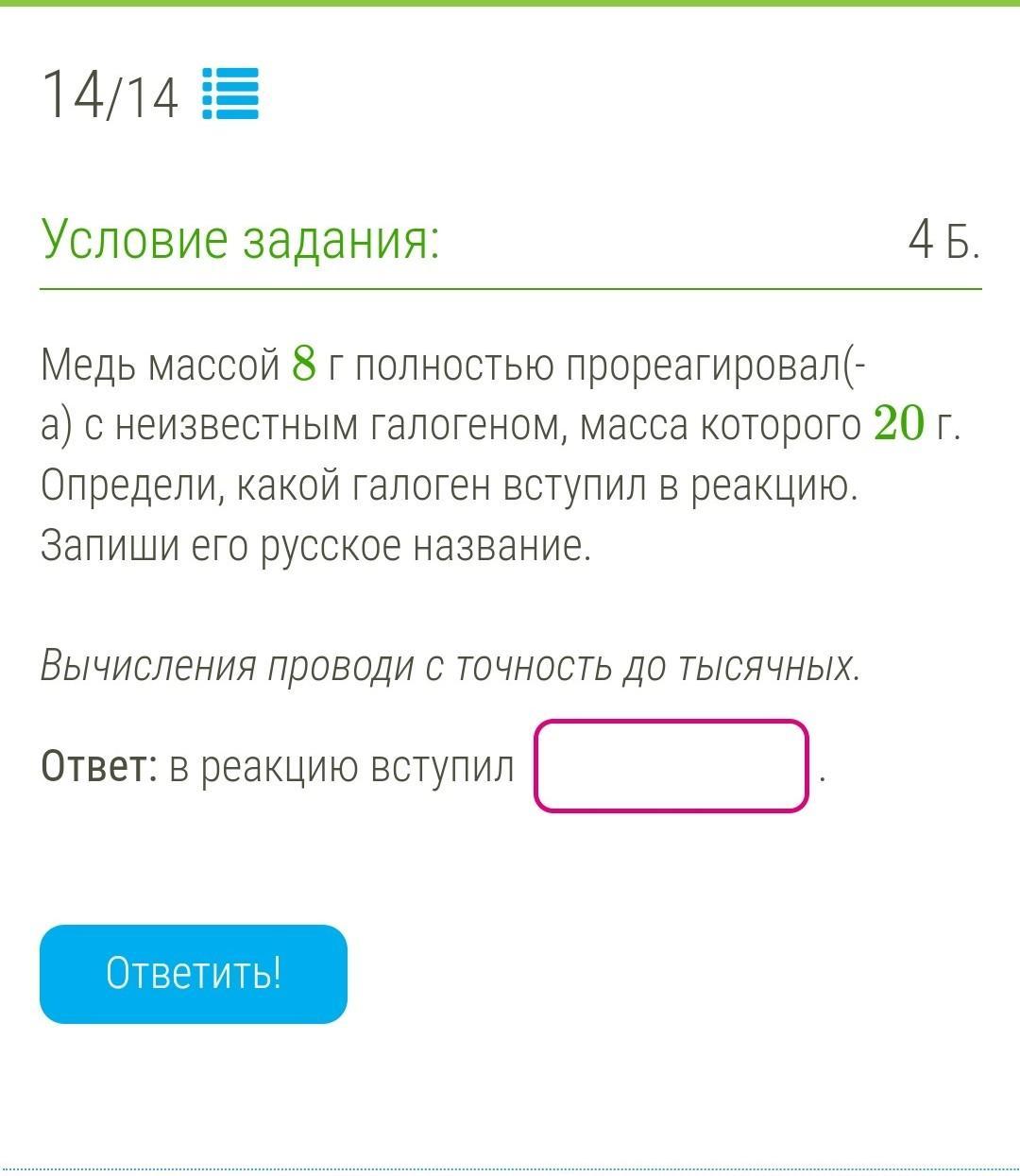 Медь массой 8г полностью прореагировал с неизвестным галогеном, масса которого 20 г. определи, какой галоген вступил в реакцию. Запиши его русское название