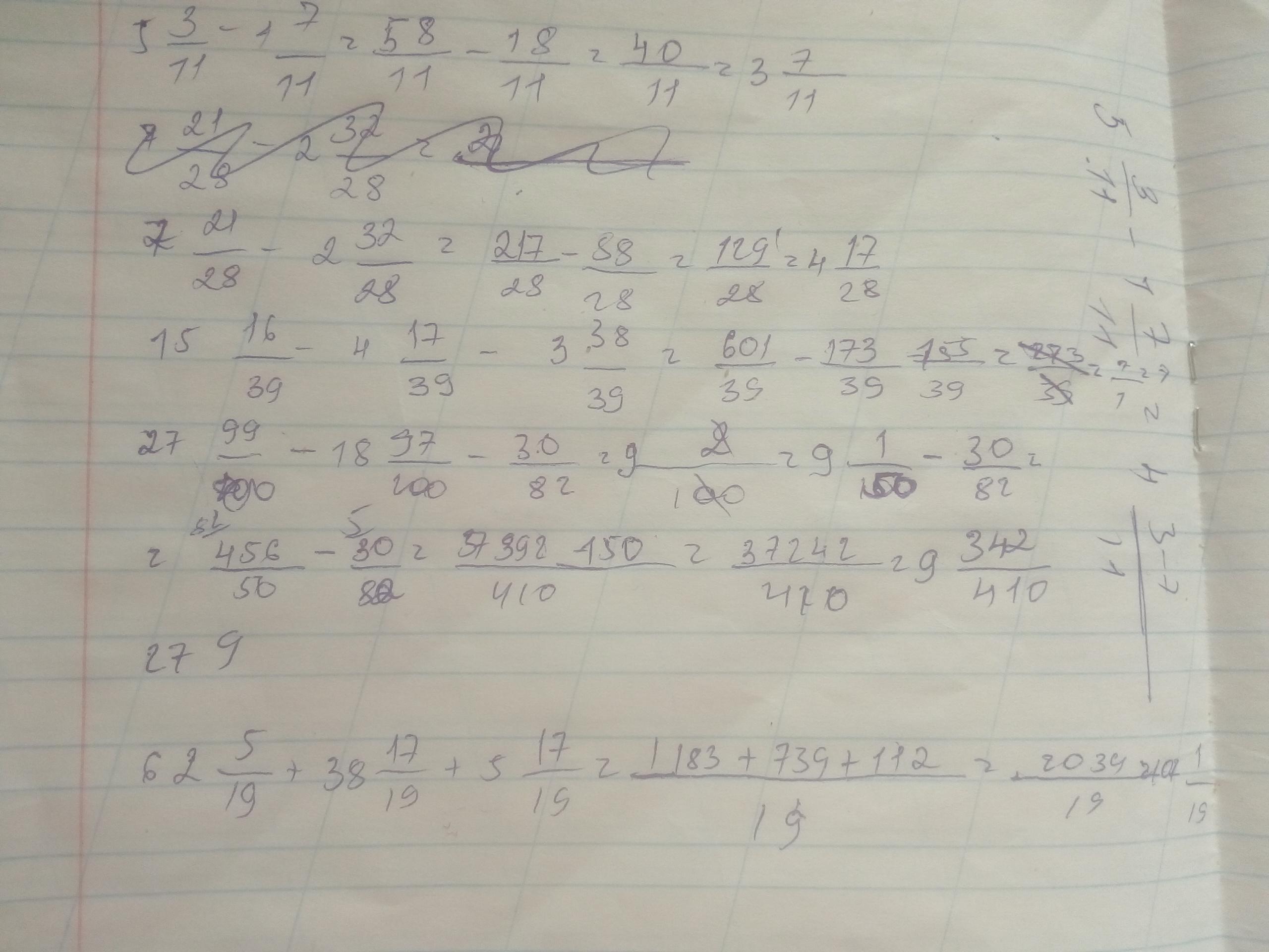 Ответ:5 3/11-1 7/11=3 7/11 7 21/28-2 32/28=4 17/28 15 16/39-4 17/39-3 38/39=7 62 5/19+38 17/19+5 17/19=107 1/19