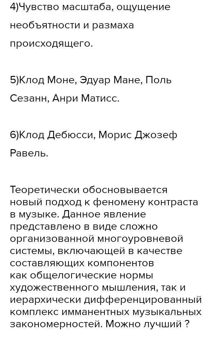 Ответь 1. В чем проявляется сходство импрессионизма в музыке и живописи? 2. Назовите художников-импрессионистов. 3. Назовите композиторов-импрессионистов. 4. Как проявляется контраст в музыке и живописи?