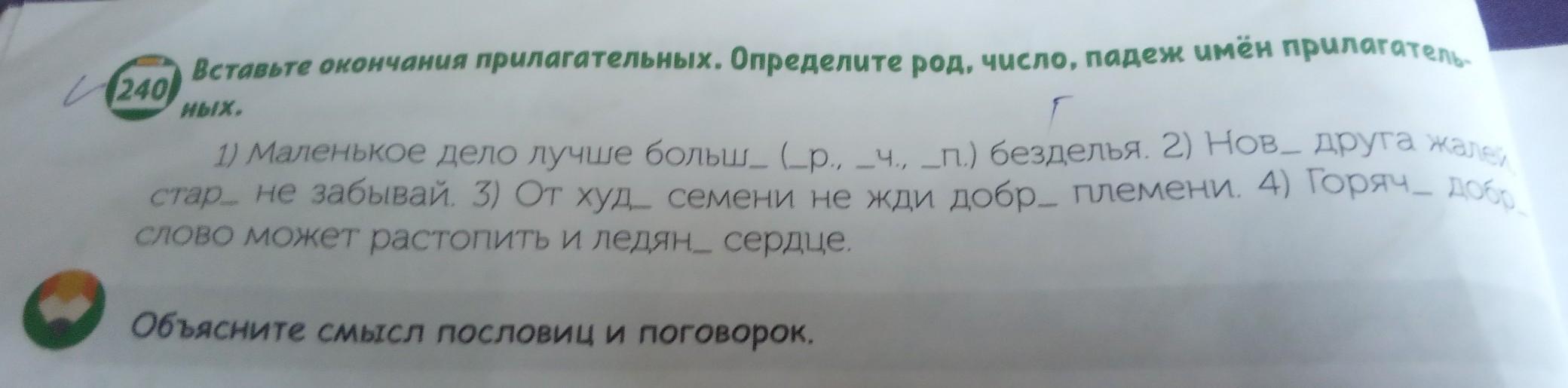 1) Маленькое дело лучше большого (ср. р., ед. ч., род. п.) безделья. 2) Нового (м.р., ед. ч., род. п.) друга жалей, старого (м. р., ед. ч., род. п.) не забывай. 3) От худого (ср. р., ед. ч., род. п.) семени не жди доброго (ср. р., ед. ч., род. п.) племени. 4) Горячее (ср. р., ед. ч., ед. п.) доброе (ср. р., ед. ч., ед. ч.) слово может растопить и ледяное (ср. р., ед. ч., винит. п.) сердце.