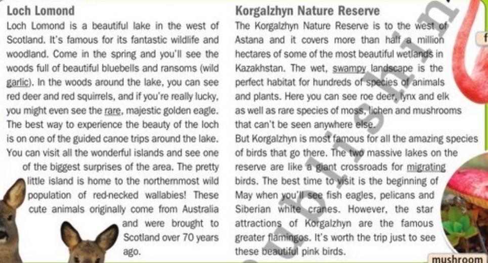 Loch Lomond Korgaizhyn Nature Reserve hy Loch Lomond is beautful lake in the west of The Korgaizhyn Nature Reserve is t the Scotiand. it's famous for its fantastic widiife and Astana and & covers more than hit f woodland. Come in the spring and you'll see the hectares of some of the most beaut wey woods full of beautful biuebelis and ransoms (mid Kazakhstan, The wet, swamoy langecape is the Garhc). in the woods sround the take, you can see perfect habitat for hundreds of’sheties of“anamals red deer and red squarels, and if you're really lucky, and plants. Here you can see roe deer, fir and otk you fugit even see the fare, mayesuc golden eagle. pacantbe sen ananen OS) and mushrooms The best way to expenence the beauty of the loch — that can't be seen anywhere is on one of the guided canoe tnps around the lake. Bua Korgalznyn ie mo famous fra the aman species You can visit ail the wonderful islands and see one of birds that go there. ‘Typ massive lakes on the of the begest surprises of the area. The pretty reserve are ke 4 ant crossroads for migrating tte island is home to the northemmost wid beds. The best tme to yRi is the beginning of population of rednecked wallatves! These May when you’ fish eagles, pelicans and i cule animals ongmnally come from Australia Siberian Finders. However, the star and were brougm to attractiong of Korgalzhyn are the famous Scotland over 70 years gos ploy snort be oe oo wa ago. these Supls pink birds.