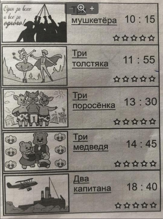 На афише представлено расписание сеансов кинотеатра на сегодня. После каждого сеанса в зале проводится уборка. Уборку нужно закончить за 10 минут до начала следующего сеанса. Известно,что мультфильм "Три толстяка" состоит из двух частей, которые показывают без перерыва,а каждая часть длится 30 минут. Рассмотри расписание и ответь на вопрос: сколько времени будет у сотрудников на уборку зала после показа мультфильма "Три толстяка"?