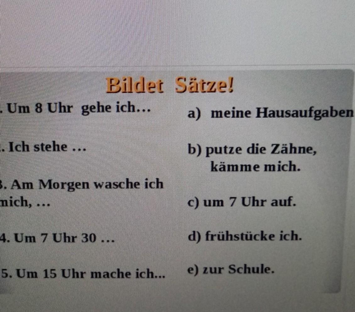 5) Um 15 Uhr mache ich a) meine Hausaufgaben