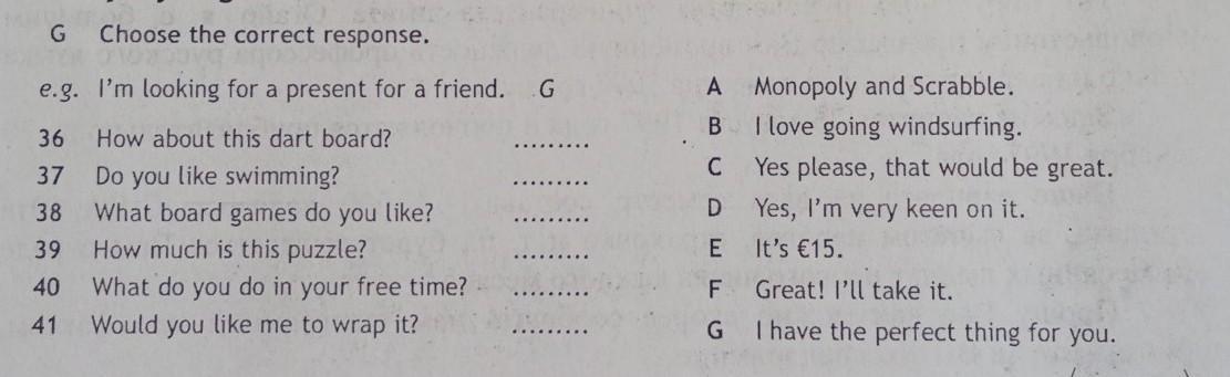 Everyday English G Choose the correct response. e.g. I'm looking for a present for a friend. G 36 How about this dart board? 37 Do you like swimming? 38 What board games do you like? 39 How much is this puzzle? 40 What do you do in your free time? 41 Would you like me to wrap it? A Monopoly and Scrabble. B I love going windsurfing. C Yes please, that would be great. D Yes, I'm very keen on it. E It's €15. F Great! I'll take it. G I have the perfect thing for you. Marks: