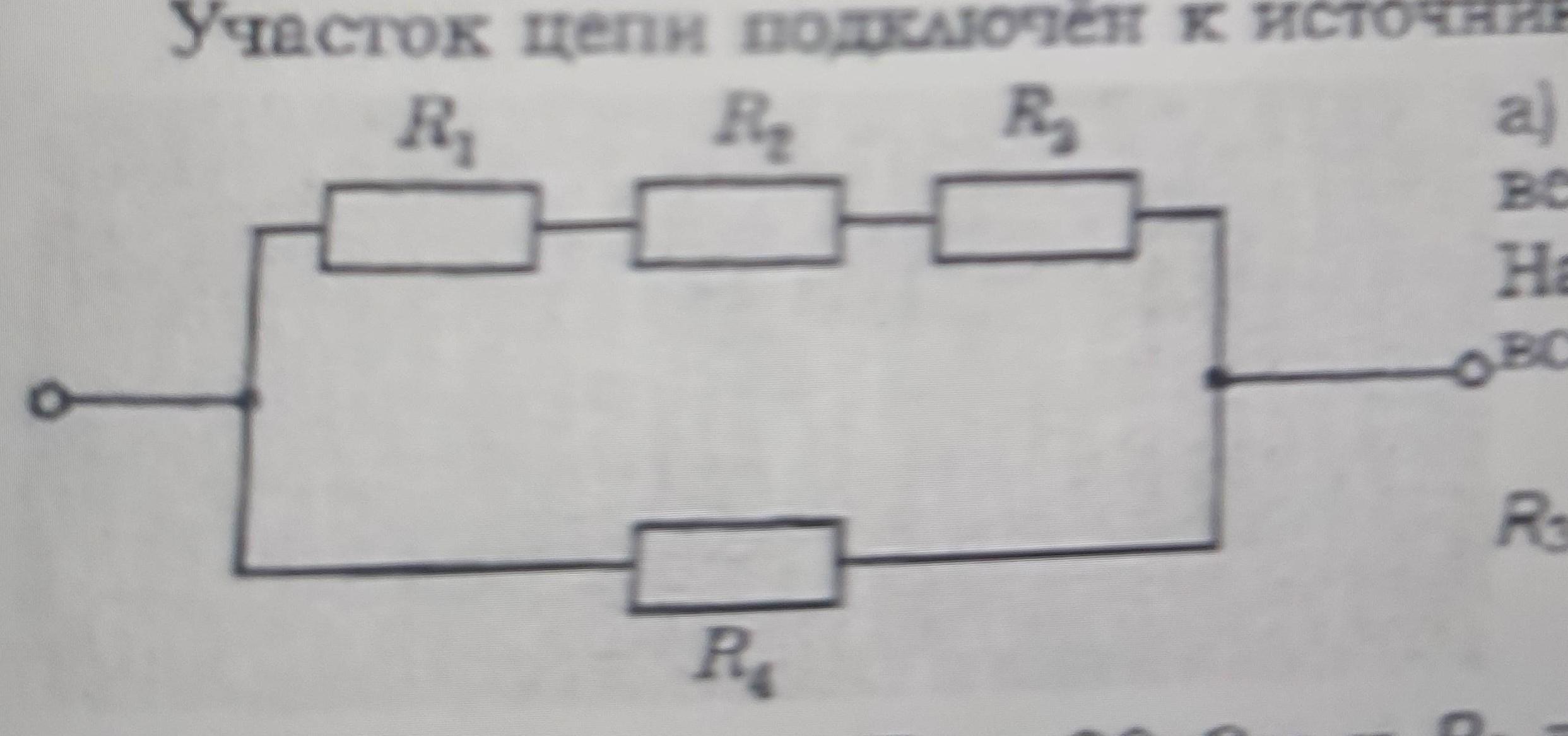 Четыре резистора с сопротивлениями R1= 60ом, R2= 15ом, R3= 3ом, R4= 12 ом соединенны по схеме изображённые на рисунке участок цепи подключен к источнику напряжения 36В а) найдите общее сопротивление ветви с резисторами R1,R2,R3 б) найдите общее сопротивление всего участка цепи в) найдите силу тока в резисторе R3 и напряжение на этом резисторе.