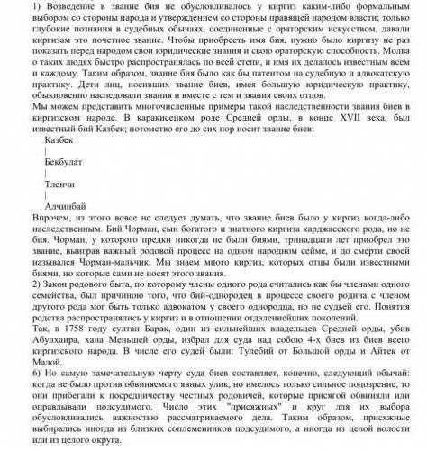 1. Почему Ч. Валиханов считал, что судебные реформы должны учитывать особенности местной традиционной системы управления ? 2. Как Ч. Валиханов объясняет место и ролль биев в казахском обществе? 3. Почему бий-однородец в процессе своего родича с членом другого рода мог быть только адвокатом своего однородца, но не судьей его? 4. Почему идея Ч.Валиханова о сохранении народного самоуправления в Казахстане была неудобной для царского правительства?
