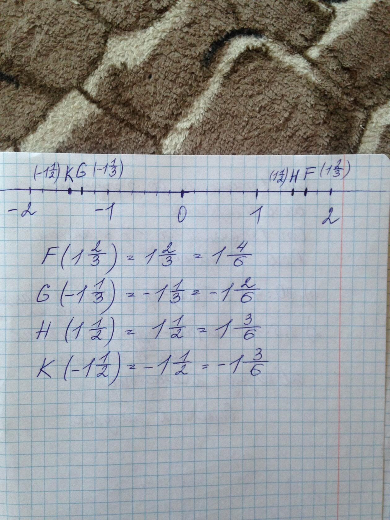 Начертить координатную прямую с единичным отрезком 6 клеток, отметить на ней точки с координатами: F(одна целая и две третьих), G(минус одна целая и одна треть), H(одна целая и одна вторая), K(минус одна целая и одна вторая)