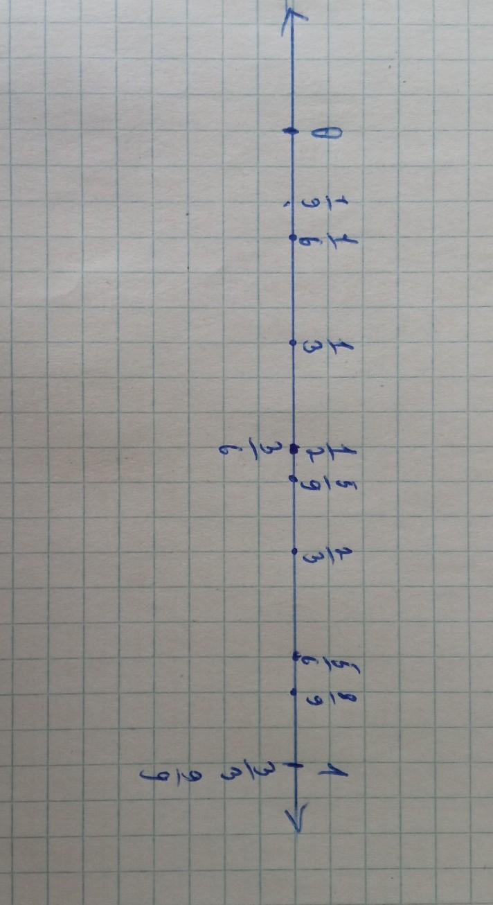 Постройте координатный луч с единичным отрезком 18клеток.На нём отметьте дроби 1/2; 1/6; 3/6; 5/6; 1/3; 2/3; 3/3; 1/9; 5/9; 8/9; 9/9;