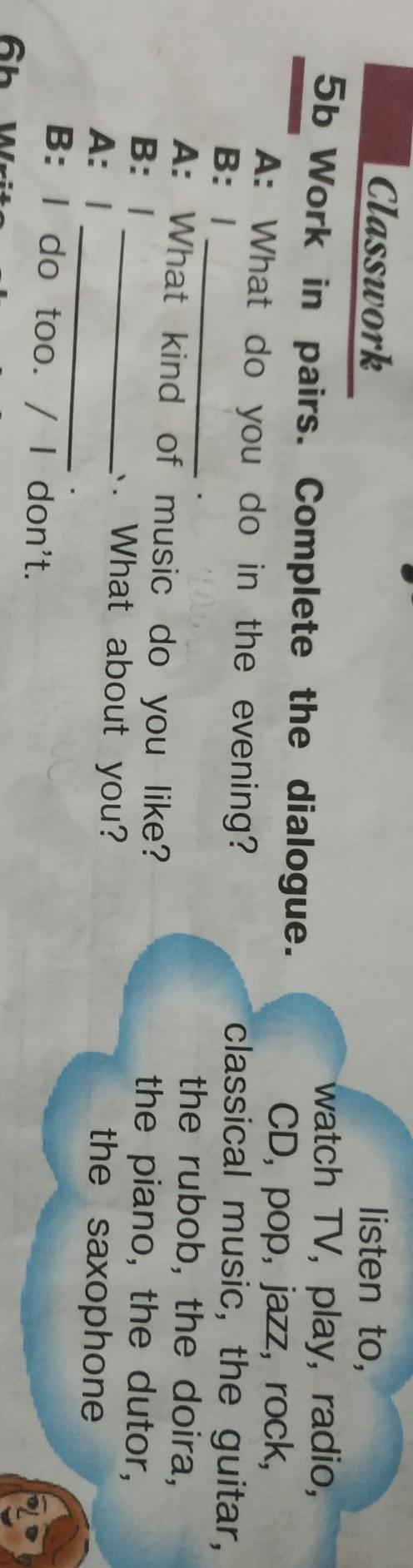 5b Work in pairs. Complete the dialogue. A: What do you do in the evening? B: 1 A: What kind of music do you like? B: 1 What about you? A: B: I do too. / I don't.