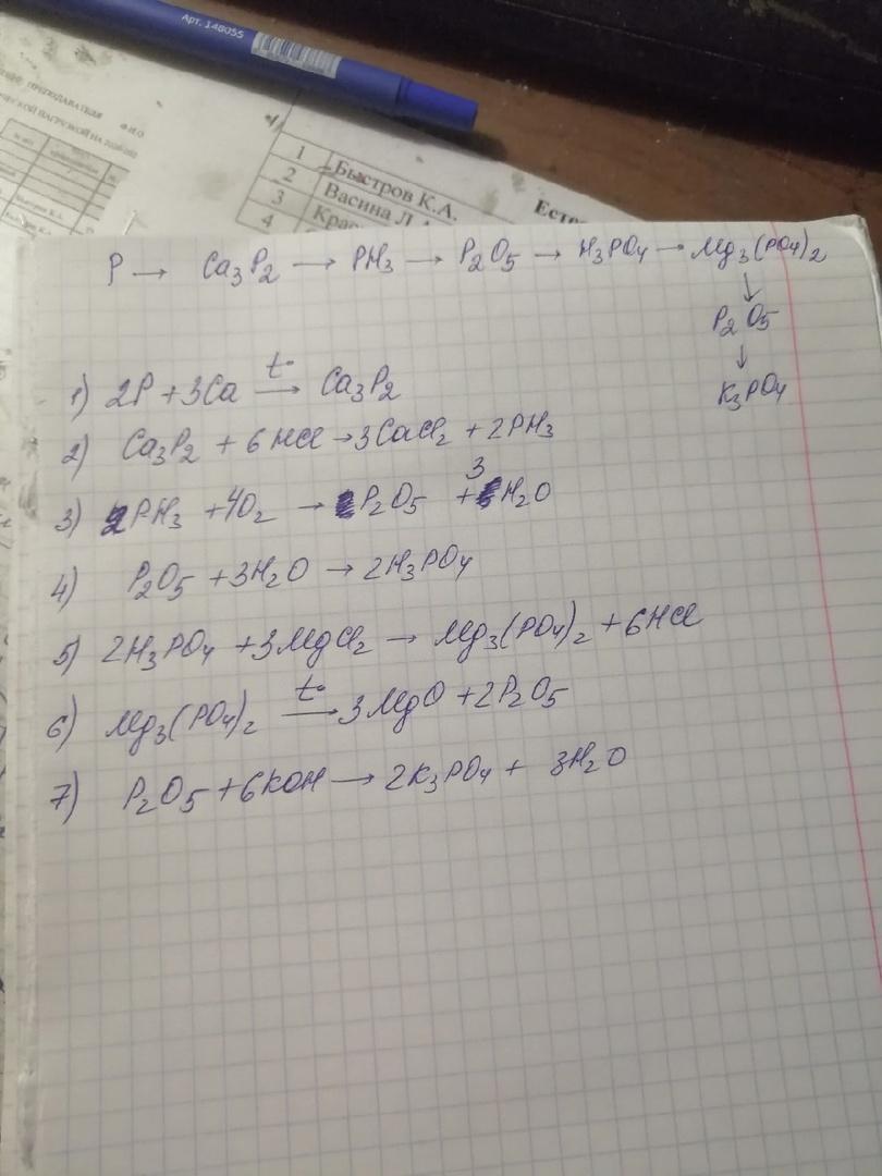 Фосфор-----фосфид кальция---фосфин---оксид фосфора (V)-----фосфорная кислота-----фосфат магния----- оксид фосфора (V)------фосфат калия