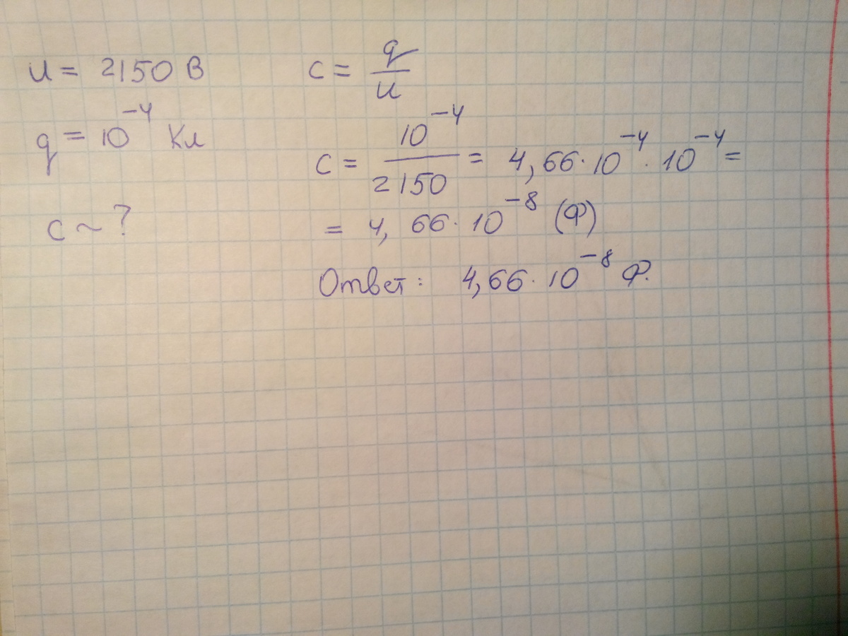 Определить емкость конденсатора если он был заряжен до напряжения 2150 В при этом заряд конденсатора 10∧(-4)Кл