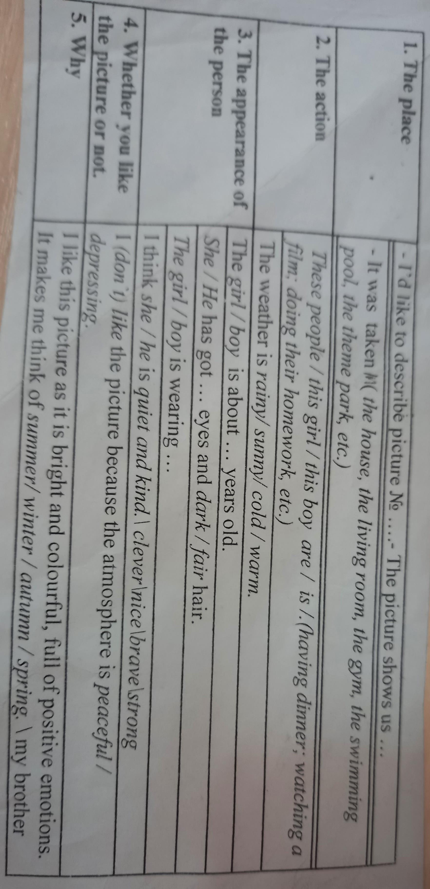 Помогите английский язык!! Описать одну из них картину (прикрепила ниже) по плану(тоже прикрепила) пж помогите мне дам 60 балов!!!!