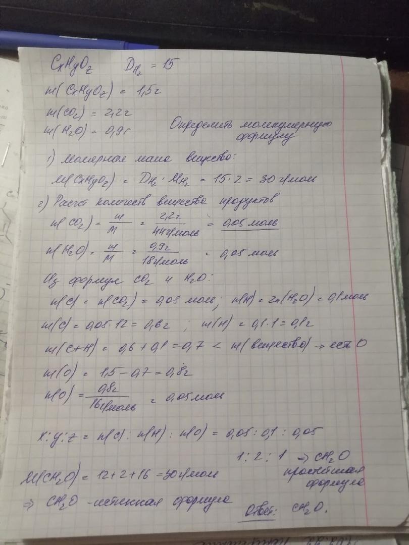 При сжигании 1.5 г вещества получили 2.2 г Co2 и 0.9 г воды. Относительная плотность вещества по водороду равна 15. Определите молекулярную формулу вещества