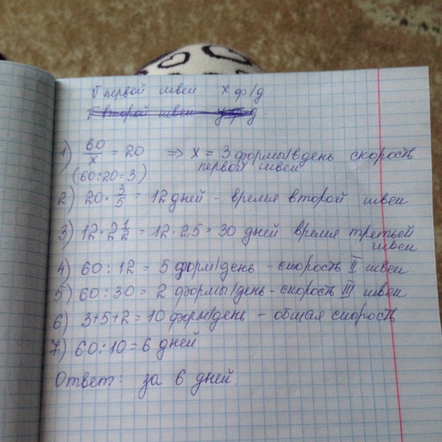 школа заказала в швейной мастерской спортивную форму для участников соревнований в количестве 60 штук. одна швея может выполнить весь заказ за 20 дней, второй для выполнения заказа требуется 3/5 этого времени,а третьей- в 2 1/2 раза больше времени , чем второй. за сколько времени выполнят весь заказ три швеи, работая совместно?"