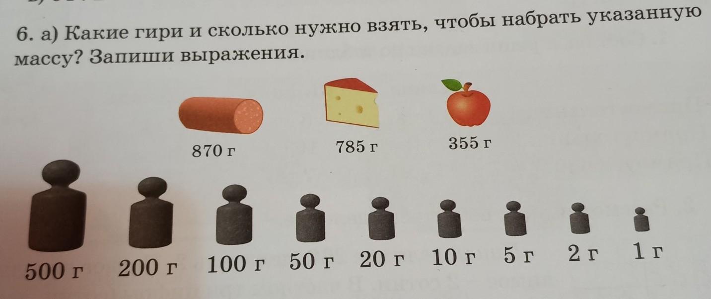 6. а) Какие гири и сколько нужно взять, чтобы набрать указанную массу? Запиши выражения. 870 г 785 г 355 г 500 г 200 г 100 г 50 г 20 г 10 г 5г 2г 1г