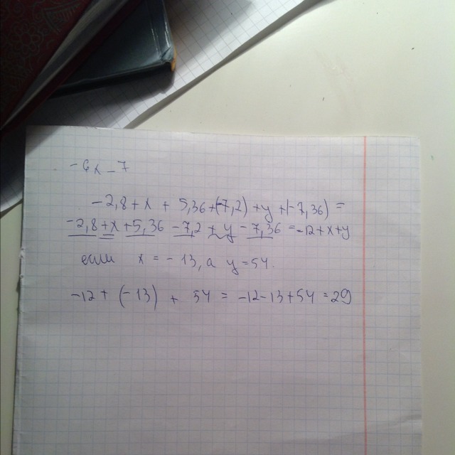 Решение упростите выражения и найдите его значения -2,8 + x + 5,36 +(-7,2)+ y +(-7,36), если x= -13, y=54