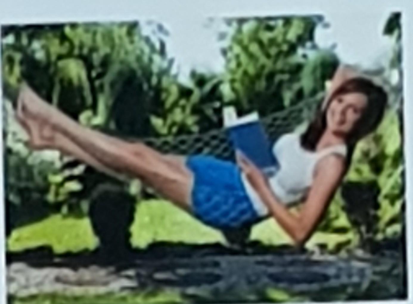 The picture shows a woman. She is reading a book. A woman is in a hammock in nature. She is wearing a white shirt and blue shorts. The cover of the book is blue. Trees can be seen in the background