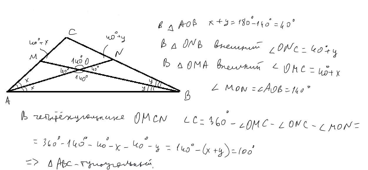 Визначте чи є трикутник АВС тупокутним, якщо його бісектриси перетинаються в точці О і кут АОВ = 140°. ДОПОМОЖІТЬ БУДЬ ЛАСКА!! даю 14 балів!)