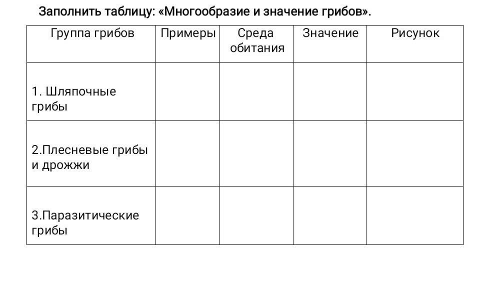1)шампиньоны,подосиновик,лисичка.Сырые места,открытые пространства,лиственные,хвойные леса.необходимое звено в цепи питания.Они вступают в симбиоз с деревьями, улучшают водный обмен и минеральное питание растений. Грибы паразиты контролируют численность организмов в биогеоценозе.