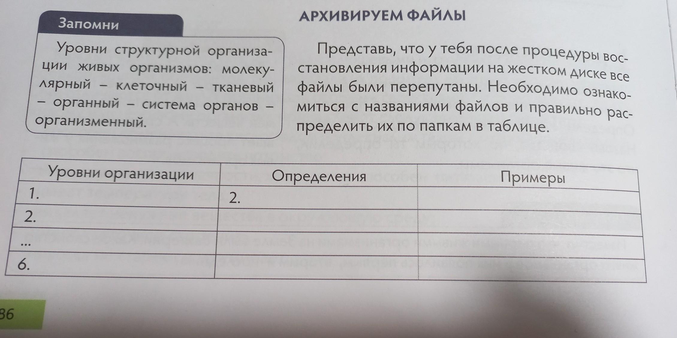 АРХИВИРУЕМ ФАЙЛЫ Запомни Уровни структурной организа- ции живых организмов: молеку- лярный клеточный тканевый органный система органов организменный. Представь, что у тебя после процедуры вос- становления информации на жестком диске все файлы были перепутаны. Необходимо ознако- миться с названиями файлов и правильно рас- пределить их по папкам в таблице. - Уровни организации Определения Примеры 1. 2. 2. . 6.