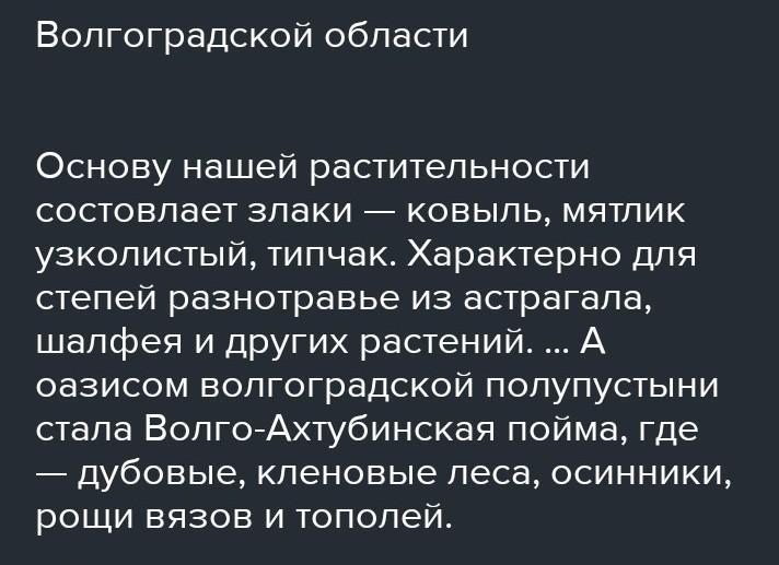 Основу нашей растительности состовлает злаки — ковыль, мятлик узколистый, типчак. Характерно для степей разнотравье из астрагала, шалфея и других растений. ... А оазисом волгоградской полупустыни стала Волго-Ахтубинская пойма, где — дубовые, кленовые леса, осинники, рощи вязов и тополей.