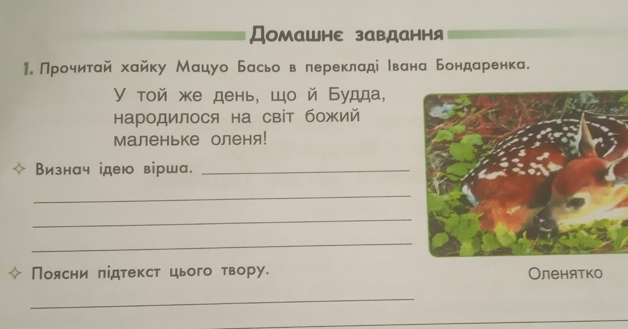1. Прочитай хайку Мацуо Басьо в перекладі Івана Бондаренка. У той же день, що й Будда, народилося на світ божий маленьке оленя! Визнач ідею вірша. Поясни підтекст цього твору.