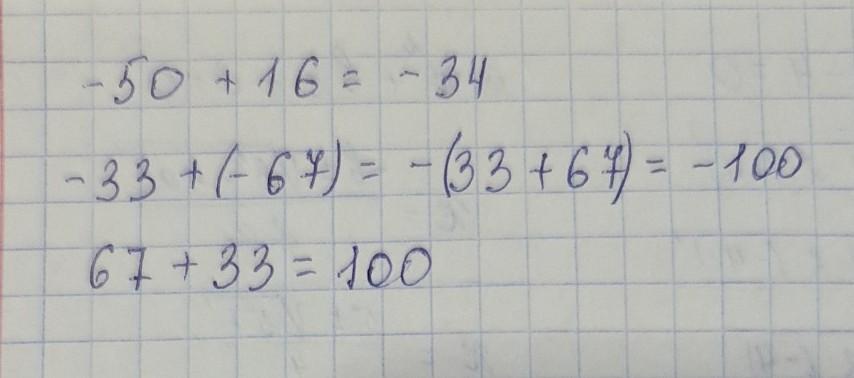 знайдіть значення виразу 1) -50+16= 2) -33+(-67)=. 3)67+33