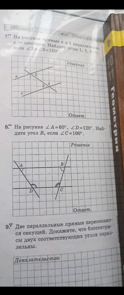 по условию <А =60° <Д=120° => по аксиоме параллельности прямых следует что прямые а и б параллельны, раз прямые параллельны, то односторонние углы в сумме дают 180° <В=180°-<С=180°-100°=80°