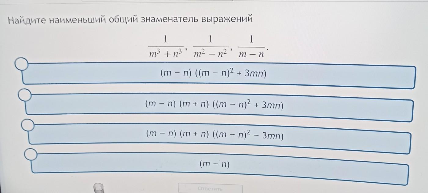 Верный второй ответ (m-n)(m+n)(m²-mn+n²), но среди ваших ответов таких не оказалось. всматривался долго.) в первых двух голубых полосках произведение mn дает положит. результат. в последней его вообще нет. а в третьей отрицателен, но с другим коэффициентом -5