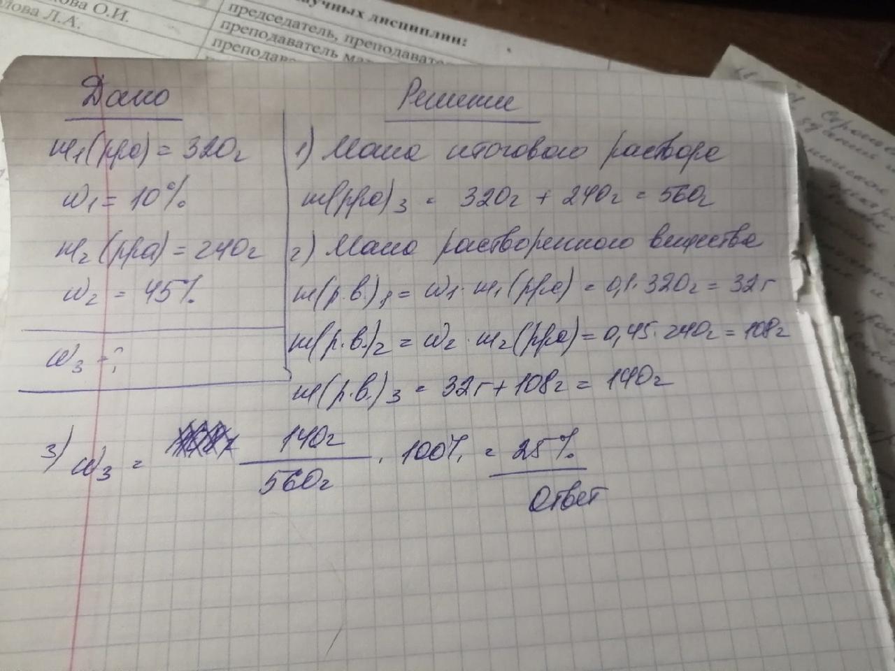 помогите: Вычислить массовую долю соли в растворе, полученном при смешивании 320 г 10%-ного раствора и 240 г 45%-ного растворов этой соли.