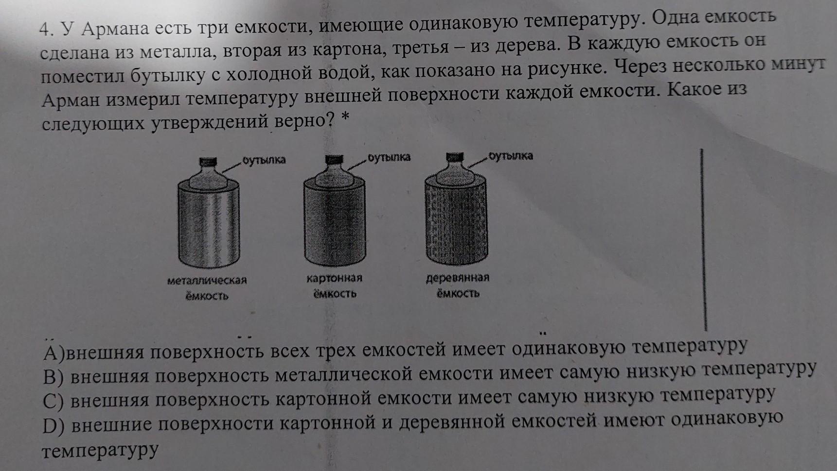 Ответ В, т.к. у метала теплопроводность выше, чем у дерева или картона.