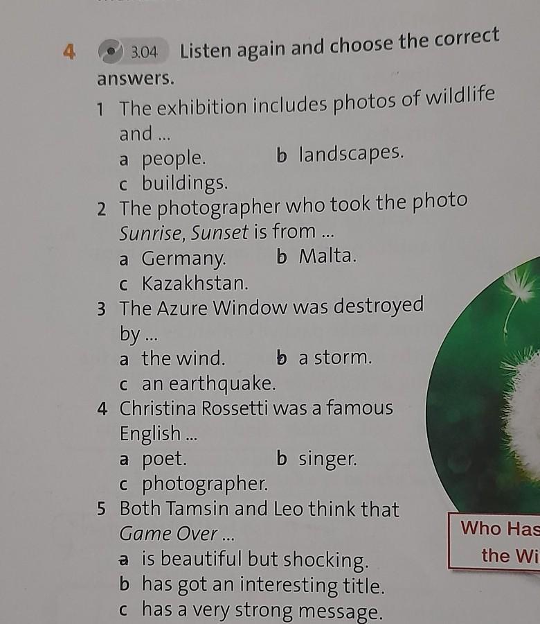 4 3.04 Listen again and choose the correct answers. 1 The exhibition includes photos of wildlife and ... a people. b landscapes. c buildings. 2 The photographer who took the photo Sunrise, Sunset is from ... a Germany b Malta. c Kazakhstan 3 The Azure Window was destroyed by ... a the wind. b a storm. c an earthquake. 4 Christina Rossetti was a famous English ... a poet. b singer. c photographer 5 Both Tamsin and Leo think that Game Over ... Who Has a is beautiful but shocking. the Win b has got an interesting title. c has a very strong message.