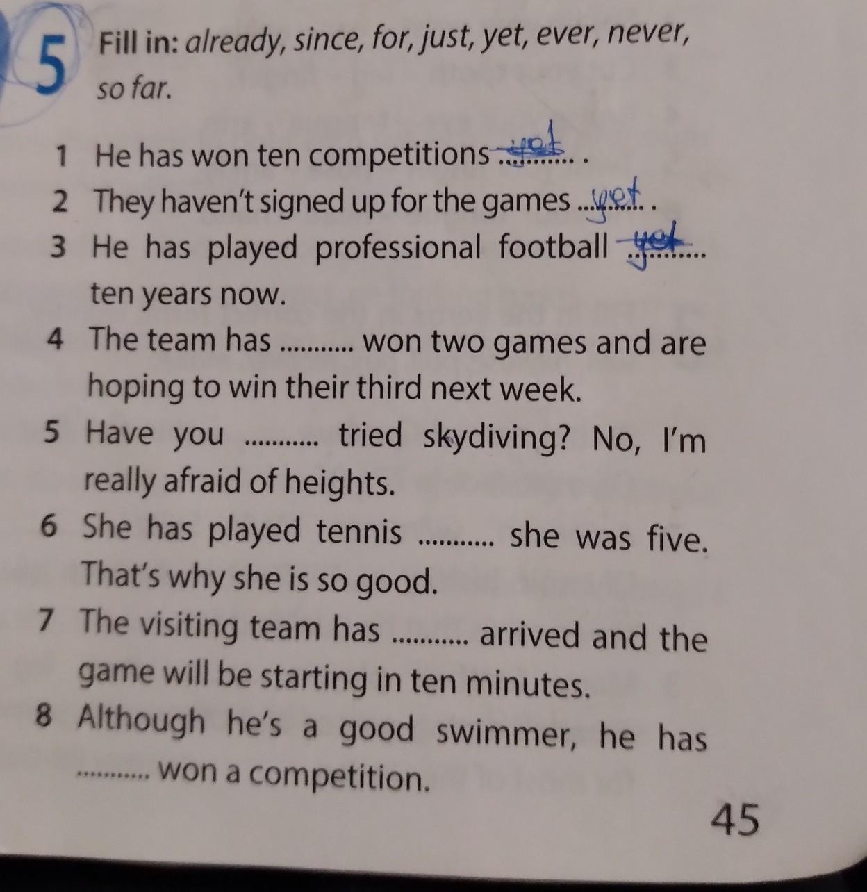 1-so far 2-yet 3-for 4-already 5-ever 6-since 7-just 8-never