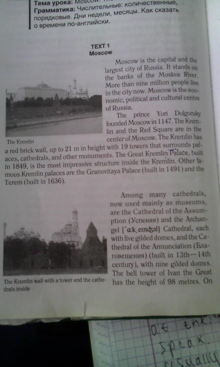 Князь Юрий Долгорукий основал Москву в 1147 году. Кремль и Красная площадь в центре Москвы. Кремль имеет красную кирпичную стену, высотой 21 м с 19 башнями, которая окружает дворцы, соборы и другие монументы. Большой кремлевский дворец построен в 1849 году, это самая впесетляющая структура внутри Кремля. Другие знаменитые Кремлевские дворцы это Грановитая палата построена в 1491 году и Палата построена в 1636 году.