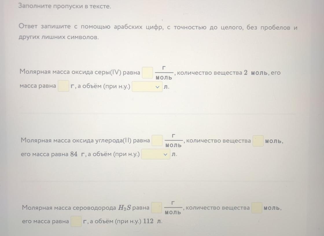 молярная масса 64, кол вещества 2 моль, след 64×2=128 г, обьем 22.4