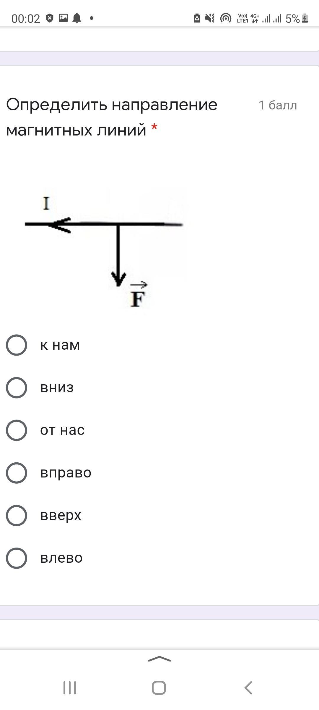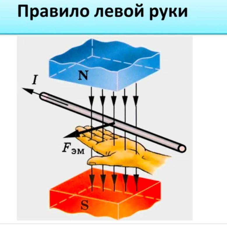 Ответ: правило левой руки. 4 пальца влево. Большой вниз. Ладонь повернута к нам. В нее входят силовые линии магнитного поля. Значит идут они ОТ НАС.