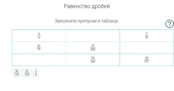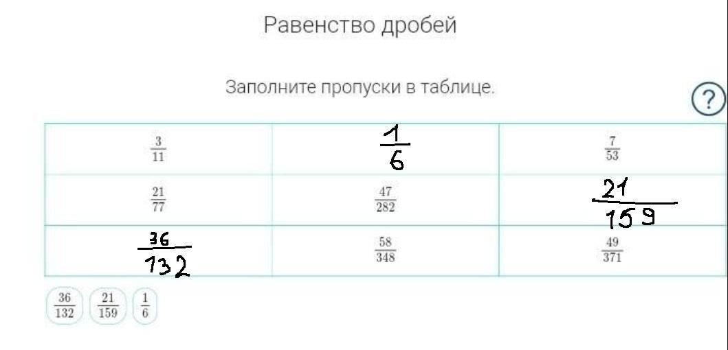 2) Беру второе из трёх данных снизу чисел в ответах: 21/159. Сокращаю на 3 и выходит => 7/53. Такое число в третьей колонке. Записываю 21/159 в свободный "квадрат" в 3-ей колонке.