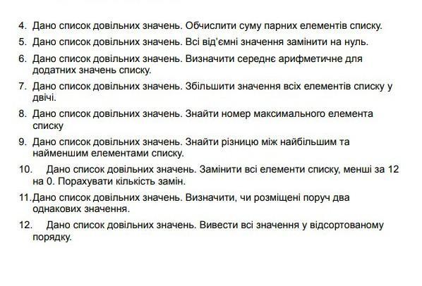 4. Дано список довільних значень. Обчислити суму парних елементів списку. 5. Дано список довільних значень. Всі від'ємні значення замінити на нуль. 6. Дано список довільних значень. Визначити середне арифметичне для додатних значень списку. 7. Дано список довільних значень. 3більшити значення всіх елементів списку у двічі. 8. Дано список довільних значень. Знайти номер максимального елемента списку 9. Дано список довільних значень. Знайти різницю між найбільшим та найменшим елементами списку. Дано список довільних значень. Замінити всі елементи списку, менші за 12 на 0. Порахувати кількість замін. 11.Дано список довільних значень. Визначити, чи розміщені поруч два 10. однакових значення. Дано список довільних значень. Вивести всі значення у відсортованому порядку.