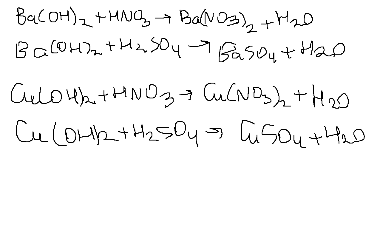 Составьте уравнения реакций: 1) Гидроксид бария с азотной и серной кислотами. 2) Гидроксид меди(2 вал) с азотной и серной кислоой.