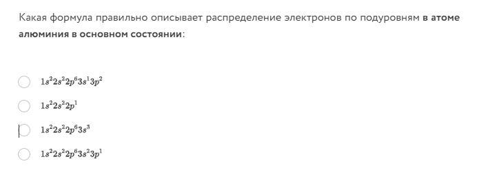 Какая формула правильно описывает распределение электронов по подуровням в атоме алюминия в основном состоянии:
